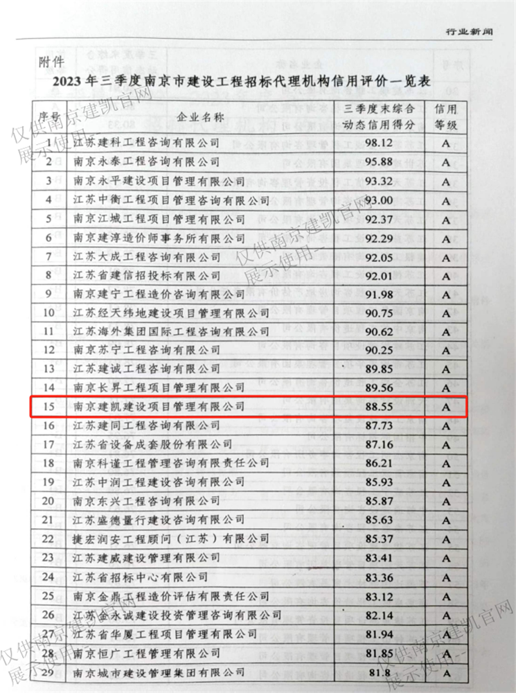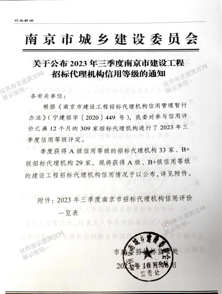 熱烈祝賀我司招標(biāo)代理機(jī)構(gòu)在“2023年三季度南京市建設(shè)工程招標(biāo)代理機(jī)構(gòu)信用評價等級A”